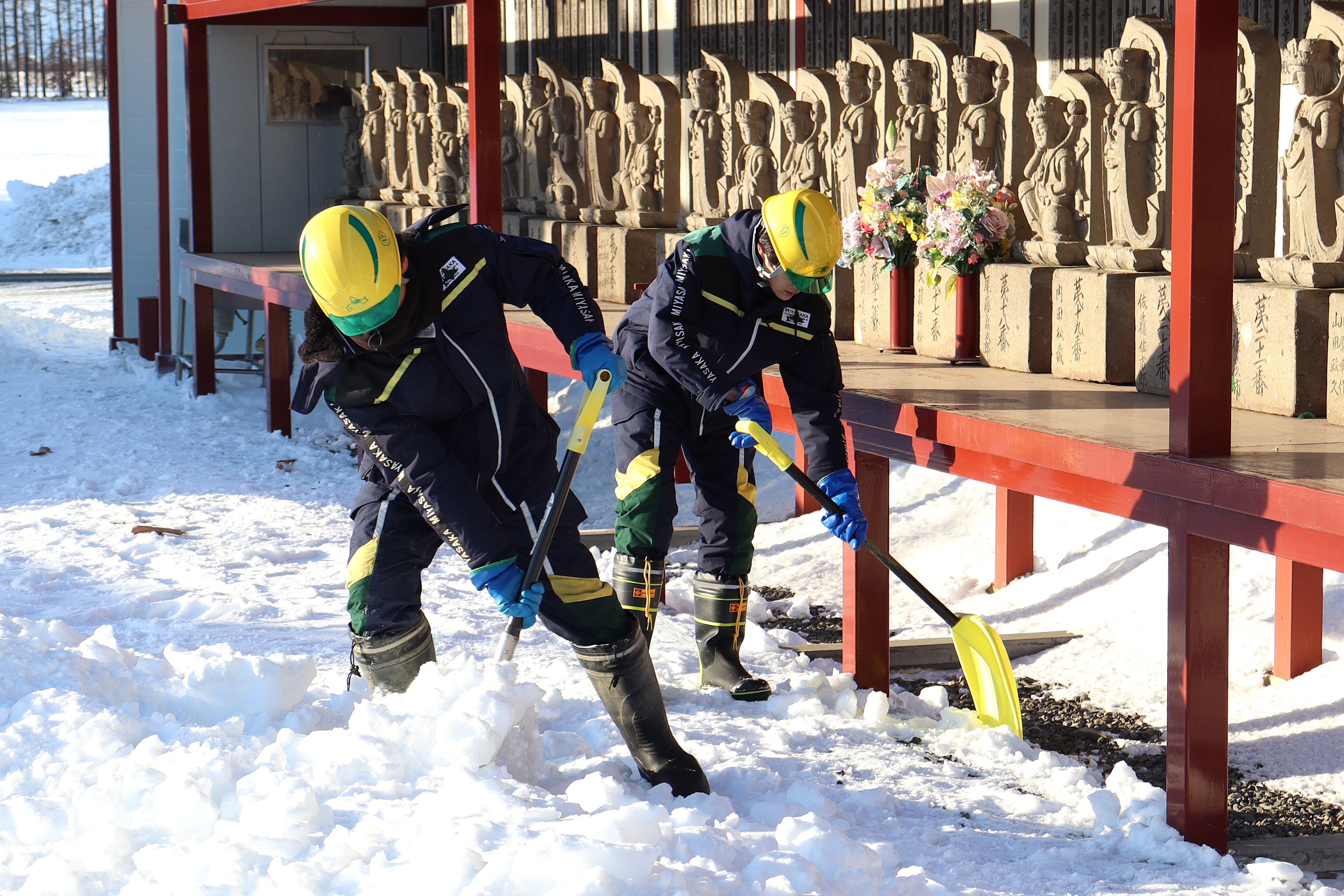 令和7年12月19日(金)、帯広市大正町の道道1号帯広空港線と市道の交差点に位置する「新西国三十三番観世音菩薩 交通安全地蔵尊」周辺の除排雪作業を実施いたしました。