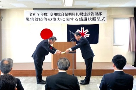 令和8年3月26日(木)、「令和7年度 空知総合振興局札幌建設管理部 災害対応等協力業者表彰式」が執り行われ、石狩総合振興局副局長 松田哲夫様より感謝状をいただきました。
