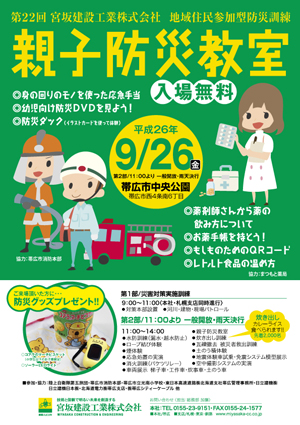 | 平成26年9月26日(金)11時より、帯広市中央公園において、当社主催の第22回 地域住民参加型防災訓練を開催いたします。 近年、東日本大震災や広島土砂災害、全国各地で発生している局地的な大雨・大雪による家屋への被害など、大規模な自然災害は地域住民に大きな不安を与えております。 北海道におきましても、平成15年の十勝沖地震や平成18年の佐呂間町竜巻災害、そして、今年8月の礼文島土砂災害により甚大な被害をもたらしたことは記憶に新しいところです。 当社は、平成15年の十勝沖地震発生を期に、この様な災害が発現した場合に地域の皆様の安全確保や応急復旧に資するため、会社及び協力会社が一体となって、24時間支援体制を整えると共に会社の持つ資材・機材などを活用して、いつでも迅速な出動ができる態勢を整えております。 また、今年の防災訓練では、広島土砂災害被災者支援で炊き出し活動を実施し、被災地や避難所などでは、女性の働く姿が多く見られたことから、新しく「親子防災教室」を実施することが決定いたしました。 地域の皆様におかれましては、地域住民参加型防災訓練にぜひご来場いただき、防災に対する意識を高め、緊急時や災害時に少しでもお役立ていただければ幸いと存じます。 なお、同日、札幌支店においても同時開催しておりますので、皆様のご来場を心よりお待ち申し上げます。 常務執行役員本店長 髙道 伸 ※下記リーフレットをクリックすると画面が拡大されます。 |
