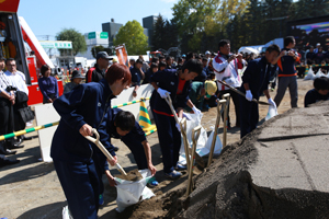 植樹場所は札幌市手稲山口緑地内(当社分の7,000㎡内)で、今年も好天に恵まれ、札幌支店役職員、OB職員、NPO法人「新山川草木を育てる集い」の皆様のご協力をいただき、総勢30名が約400本の樹木(アキグミ、ギンドロ、ミズナラ、キハダ、ブナ、千島桜等)をすくすく育つようにとの願いを込めて植樹いたしました。 今後も「森づくりに関する協定」に基づき、平成30年まで、補植・下草刈りなどを継続し、人と自然が共生できる「ふるさとの森づくり」の一助になればと考えております。 常務執行役員札幌支店長 佐々木 勝幸 |
