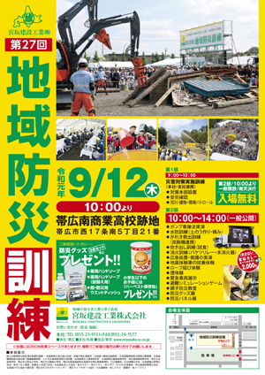 令和元年9月12日(木)10時より帯広南商業高校跡地、北広島市河川防災ステーションにおいて、弊社主催の第27回地域防災訓練を開催致しますので、多数御参加下さいますよう御案内申し上げます。 【帯広本社】 【札幌支社】 お問い合わせ先 |