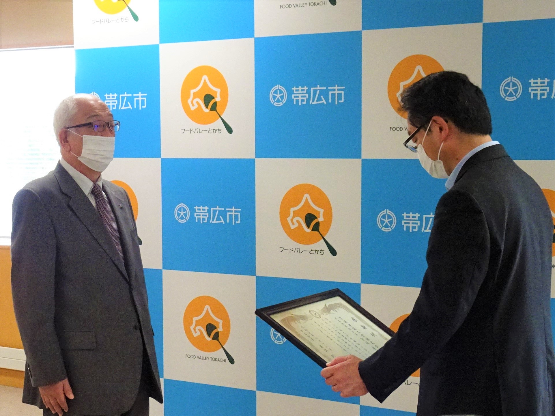 令和3年12月23日、帯広労働基準監督署において建設事業無災害表彰伝達授与式が行われ、土谷啓二郎署長様より受賞3工事の所長に表彰状が伝達されました。