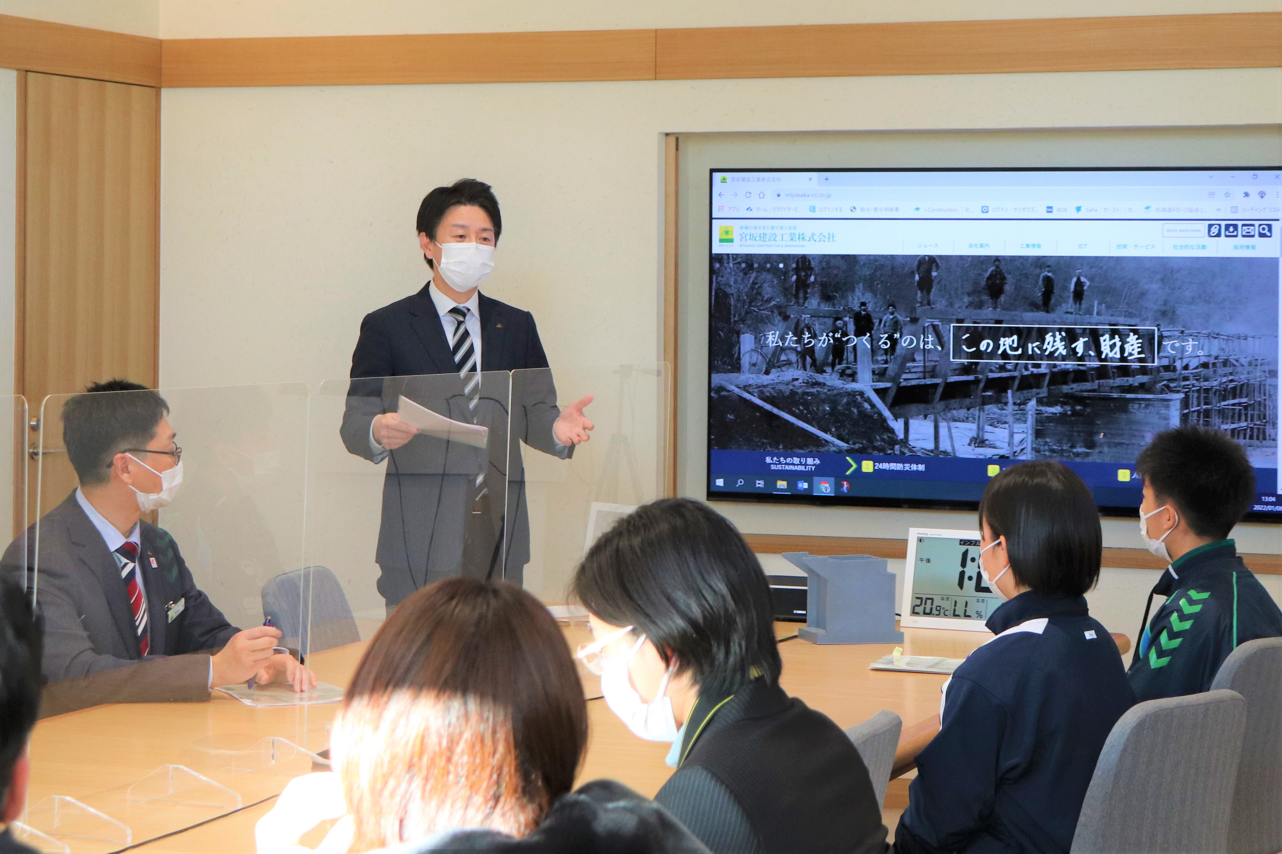 実習1日目には社内からのWEBカメラで工事現場をリアルタイムで確認できる様子などでICT技術の実例を示し、ドローン測量や3次元図面による設計、建機の自動化など、先端的に取り組む建設現場の現状を伝えました。