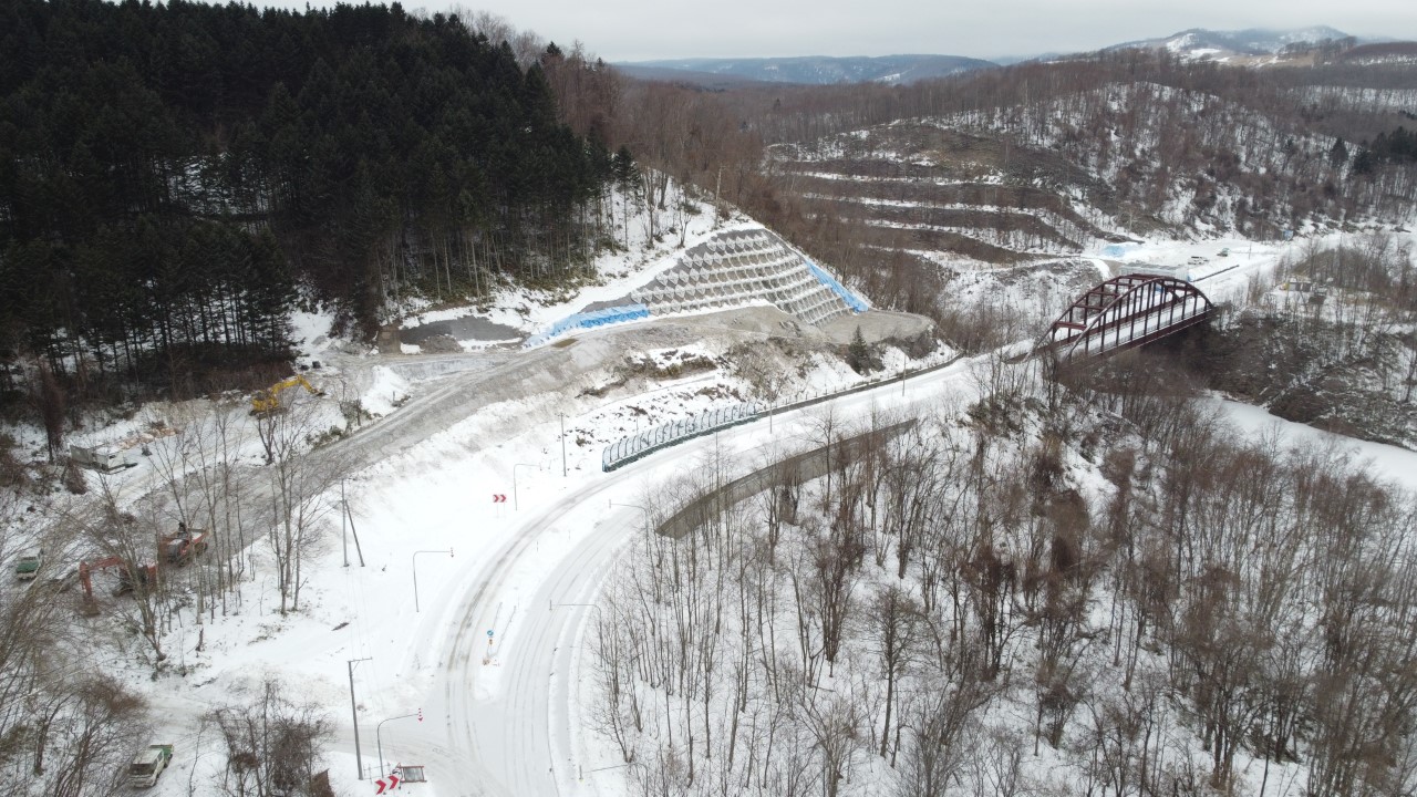 | 工事説明 | 本工事は、十勝川水系佐幌川の洪水・氾濫被害を軽減することを目的とした、佐幌ダムのかさ上げ等を行う再生事業計画内のダム周辺の道路付替工事です。 |