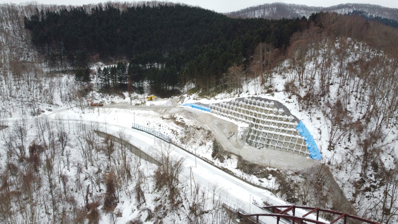 | 工事概要 | B工区 アンカー工 N=117基 掘削工(土砂)V=2,900m3 掘削工(軟岩)V=8,000m3 C工区 延長 L=387.45m 掘削工 V=1,900m3 路体盛土工 V=5,380m3 路床盛土工 V=2,470m3 下層路盤 A=2,561m2 ガードケーブル設置 L=105m |