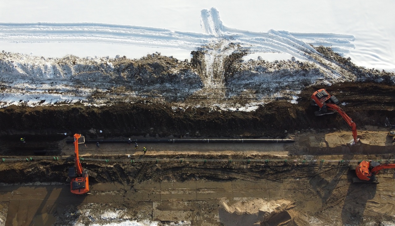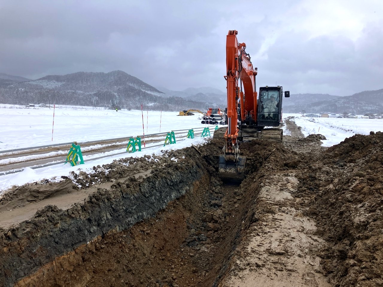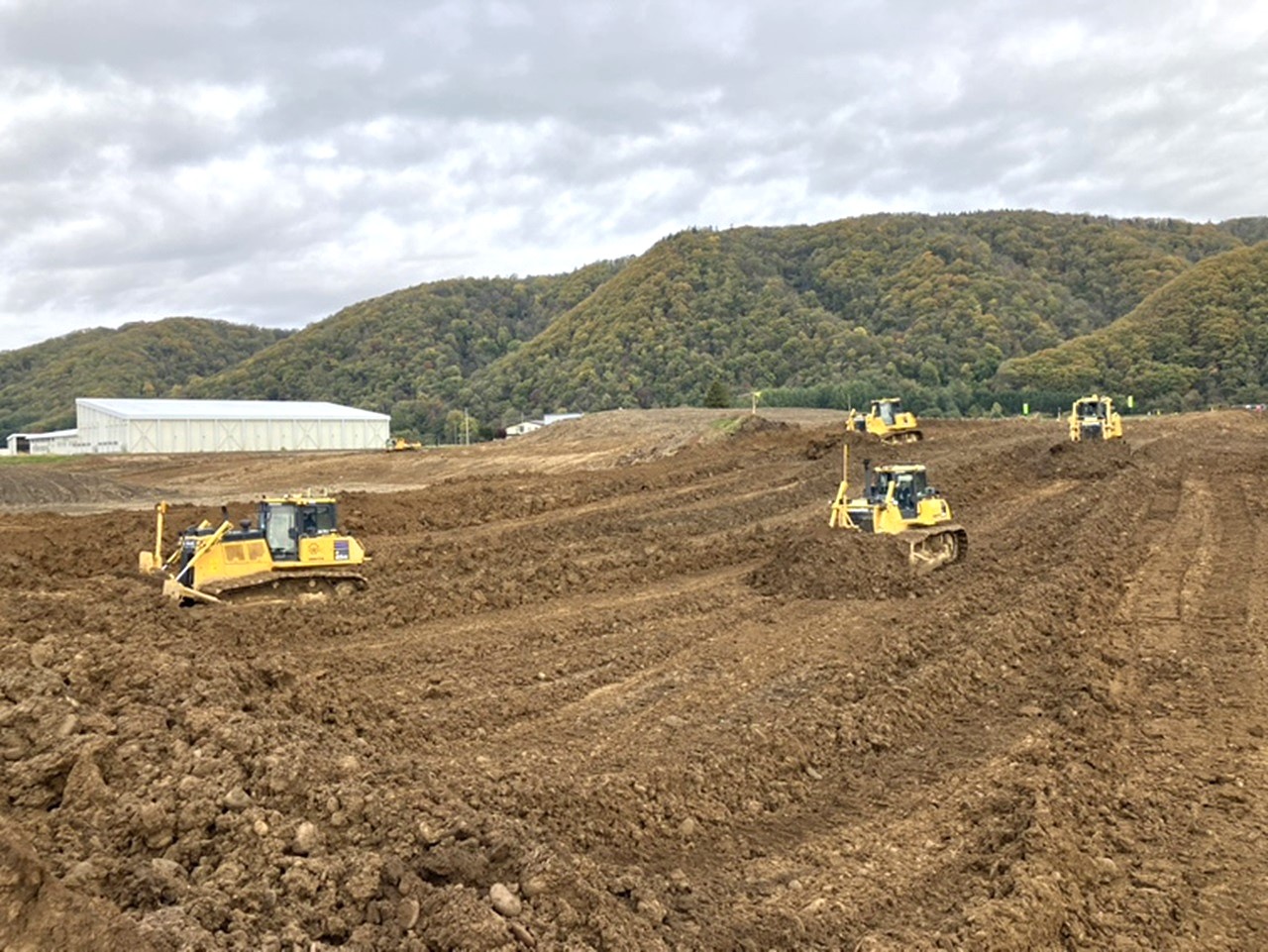 | 工事概要 | ・整地工 A≒65ha ・農道工 L≒12,900m ・ほ場内用水路工 (VUφ100~500mm) L≒5,000m ・ほ場内排水路工 (合成樹脂管φ300~900mm) L≒9,000m ・支線用水路工(DCIPφ600~800mm、Vuφ350~450mm)L≒2,100m |