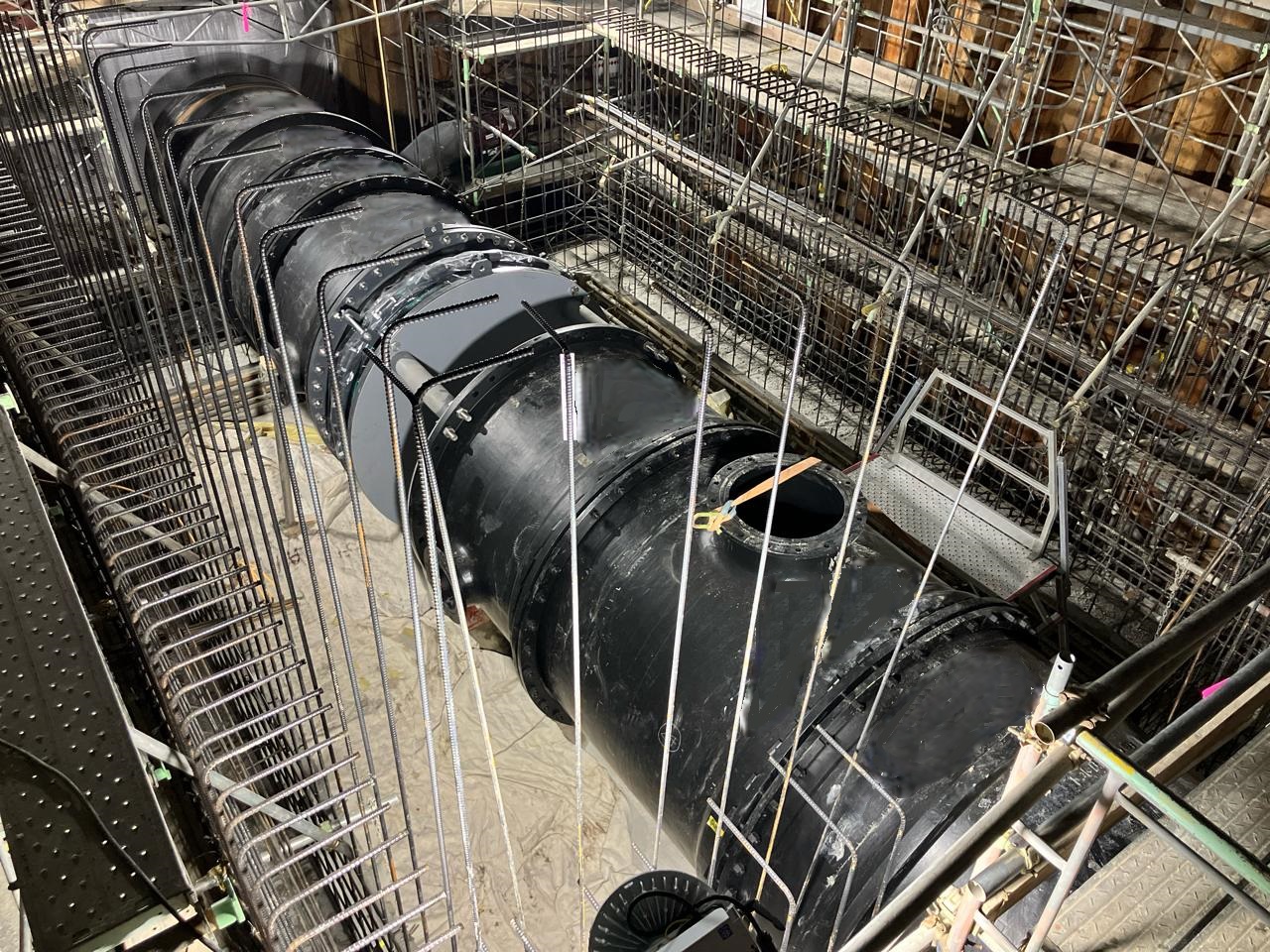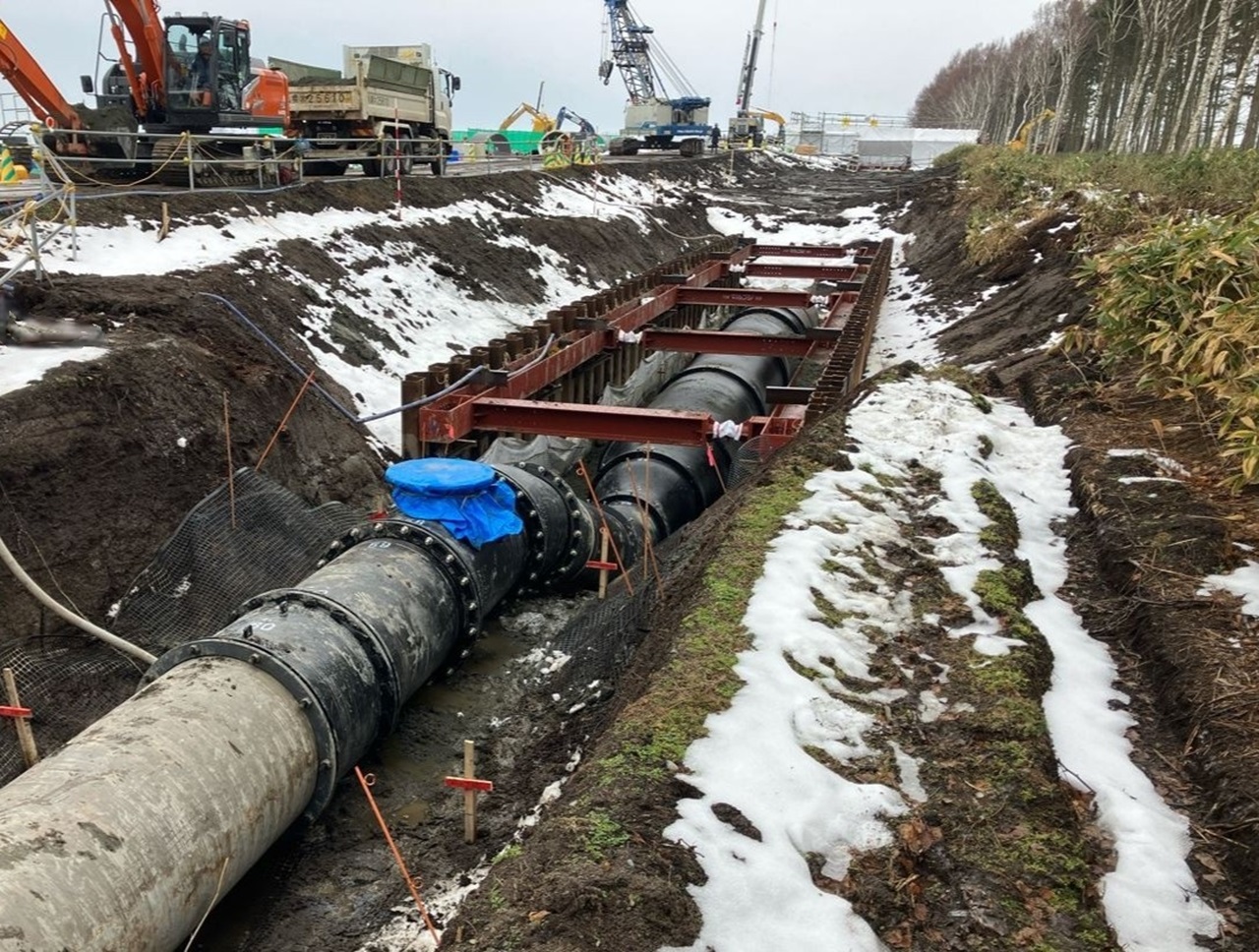 | 工事概要 | 工事延長 L=140.63m 【1工区】 土工 床掘 V=6,880m3 埋戻し V=4,330m3 ジオテキスタイル敷設 A=4,516m2 構造物撤去工 FRPM管撤去 N=29本 管水路基礎工 安定処理工 V=1,780m3 管体工 ダクタイル鋳鉄管 L=63.17m 強化プラスチック複合管 L=77.46m 空気弁工 N=1基 制水弁工 N=1基 制水弁室工 V=170m3 仮設土留・仮締切工 1式 【2工区、3工区、4工区】 空気弁室工 N=10基 |