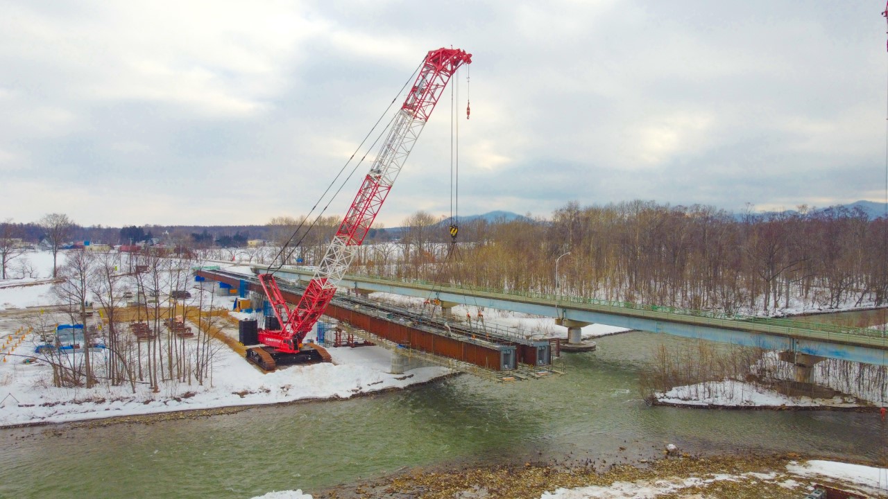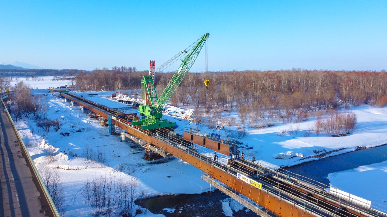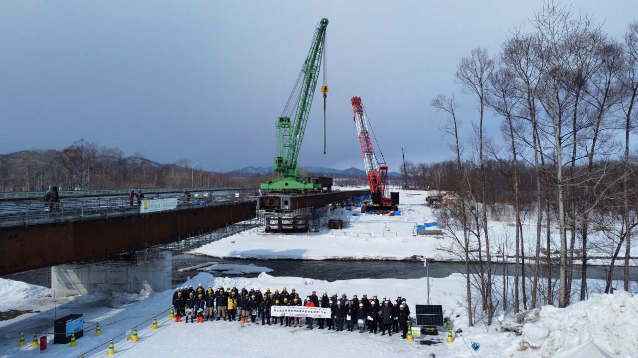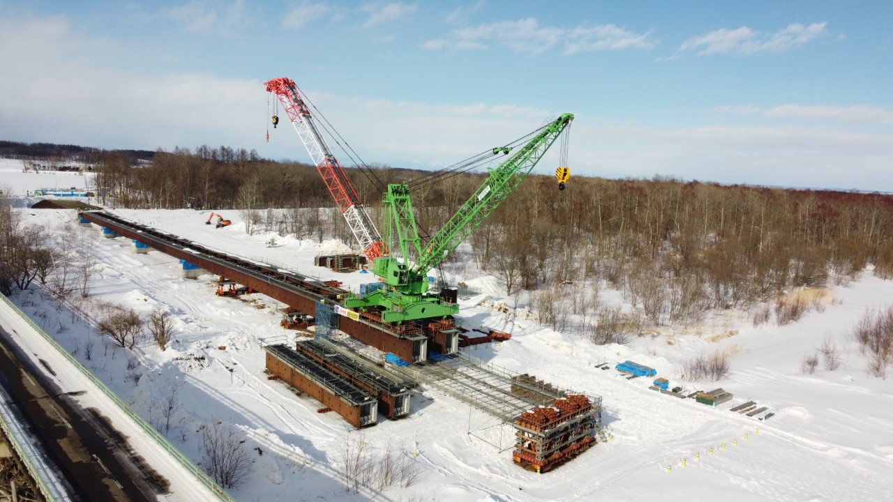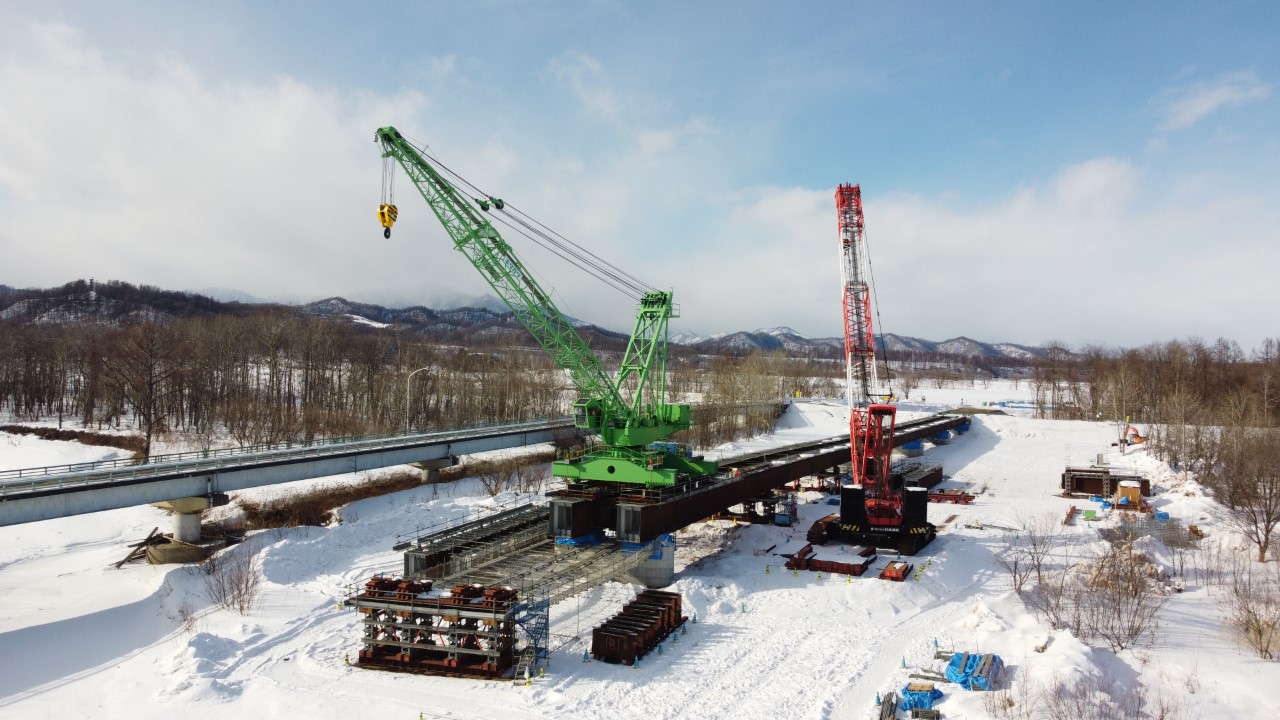 本工事は道道上札内帯広線上札内橋(新橋)の橋桁架設工事を行います。今年度の施工は全8径間架設の内、2径間(P2~P4)施工となり、河川流水部では桁上に軌条設備を設置し移動するトラベラークレーンによる桁架設を実施致します。最大で46tの重量物を吊上げる為クレーン災害防止に努めます。また施工時期は厳冬期となりますので、各種冬季型安全対策を実施し作業所一丸となって無事故・無災害で高品質な構造物を構築致します。