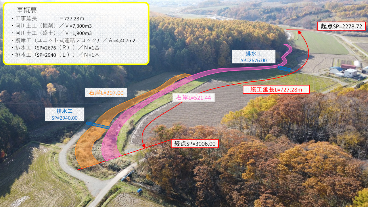 | 工事概要 | 河川土工(掘削)/V=7,300m3 河川土工(盛土)/V=1,900m3 護岸工(ユニット式連結ブロック)/A=4,407m2 排水工(SP=2676(R))/N=1基 排水工(SP=2940(L))/N=1基 管理用道路工(t=15cm)/A=1,817m2 |