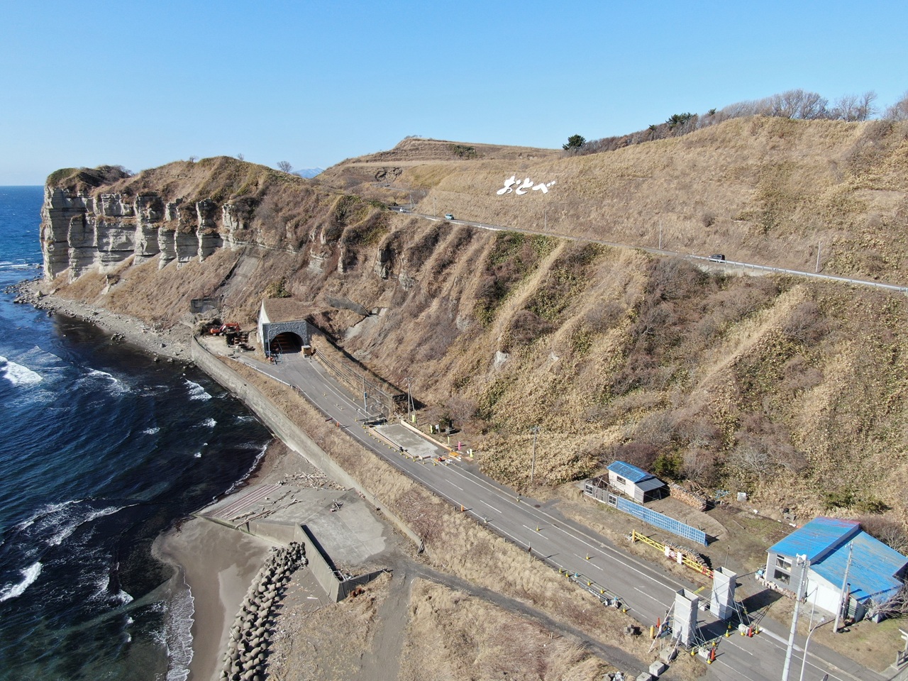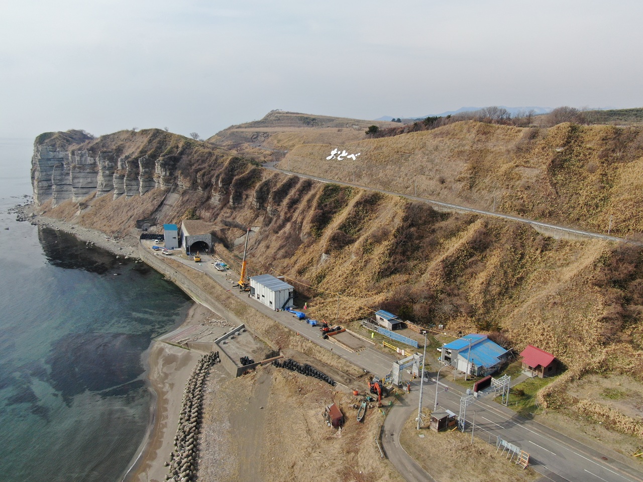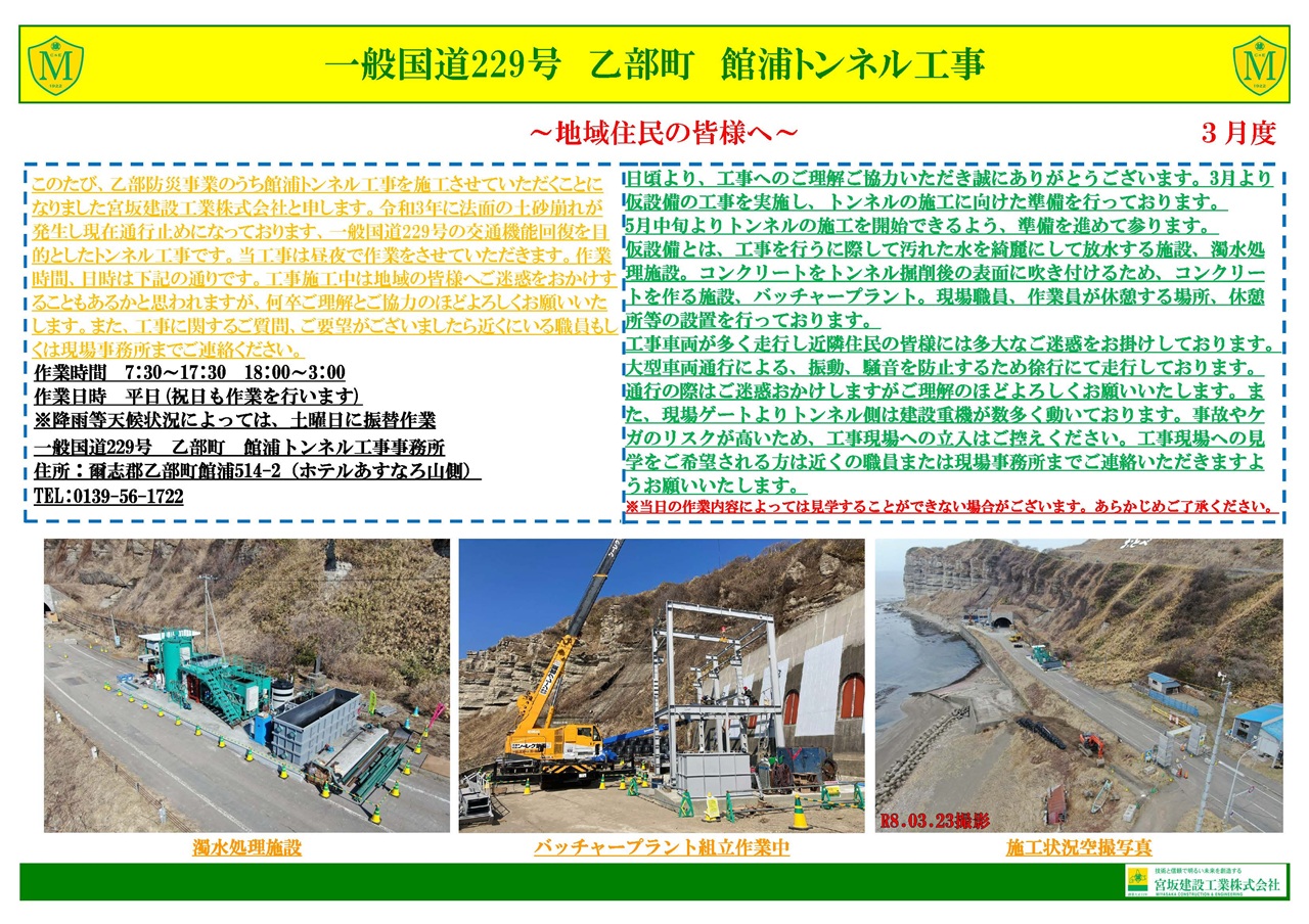 | 工事説明 | 本工事は、乙部町鳥山から館浦を結ぶ路線の岩盤崩落による通行規制区間の解消を図り、道路の安全な通行の確保を目的とした延長2kmの防災対策事業の内、館浦トンネル780mを掘削する工事となります。 |
