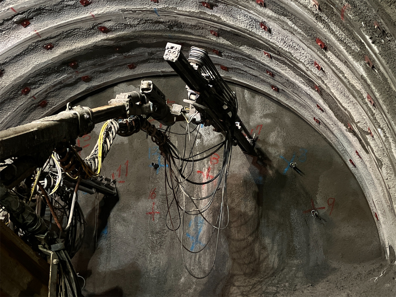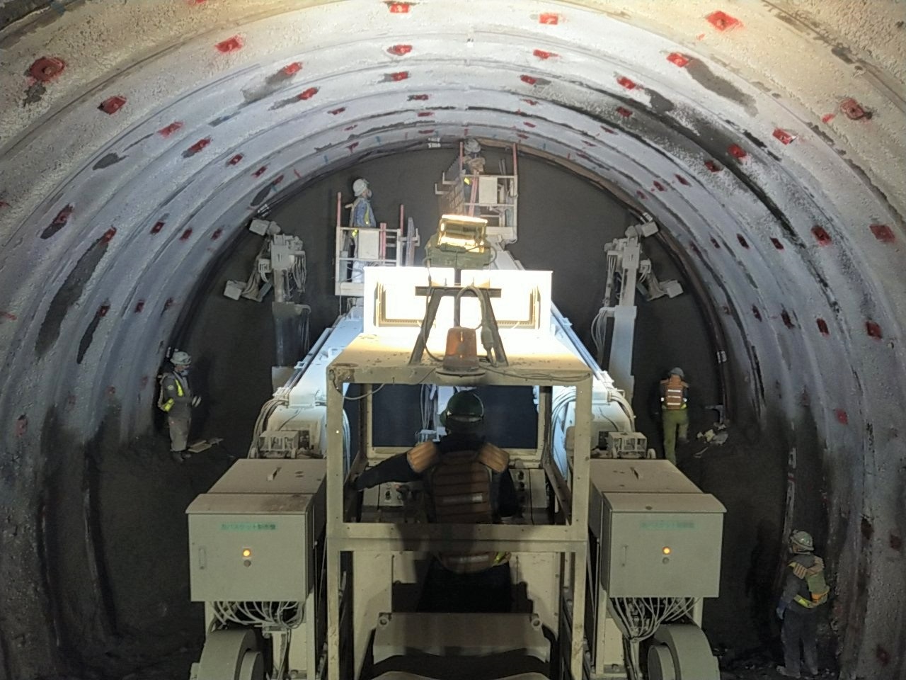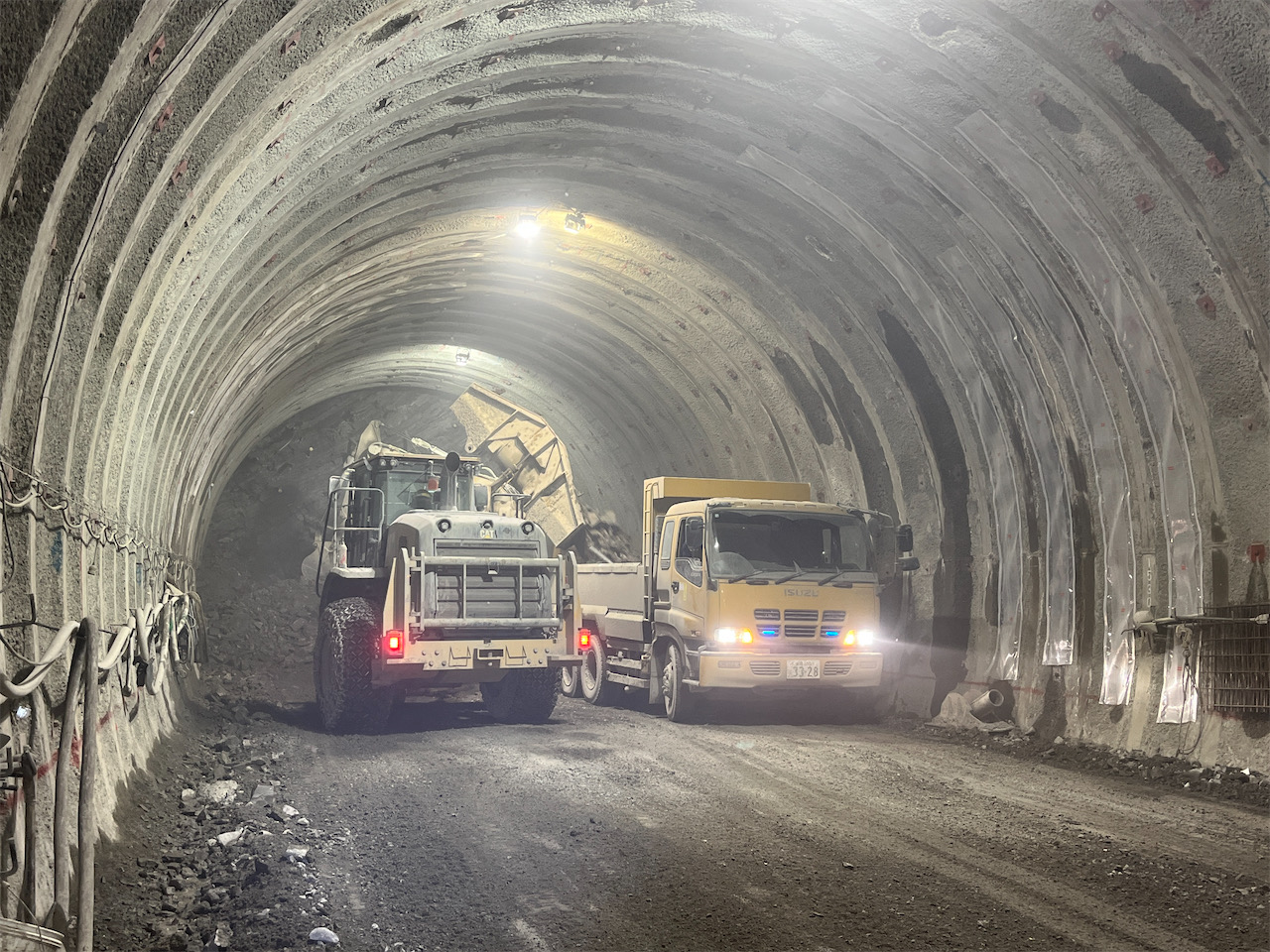 本工事は発破掘削方式で掘削を行い、切羽の掘削ズリ搬出は連続ベルトコンベア方式を採用し、人と運搬車両の接触を防止します。また、現場周辺には、猛禽類をはじめとして希少動植物が確認されているため、環境調査の実施とクラクションの抑制等を十分に配慮し、無事故、無災害での工事完成を目指します。