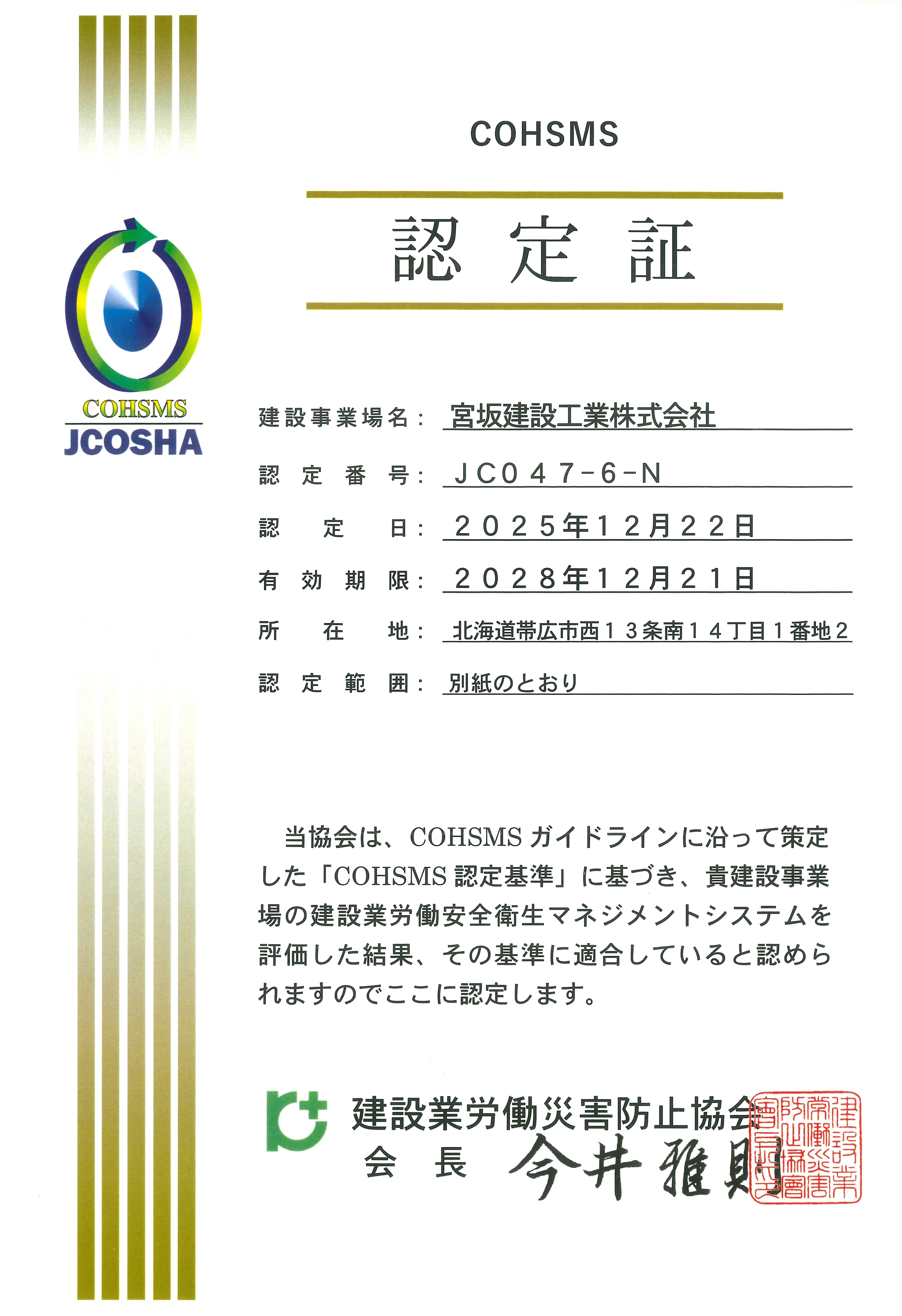 宮坂建設工業株式会社は、企業の社会的責任(CSR)の実現と社会的信頼の向上のために「安全の先取り・予防安全の完全徹底」を推進する体制を整える必要性を認識し、継続的に労働災害防止を図り、全社員・作業員の健康増進及び快適な職場環境形成促進をもって安全衛生水準を向上させていくCOHSMS認定を取得いたしました。